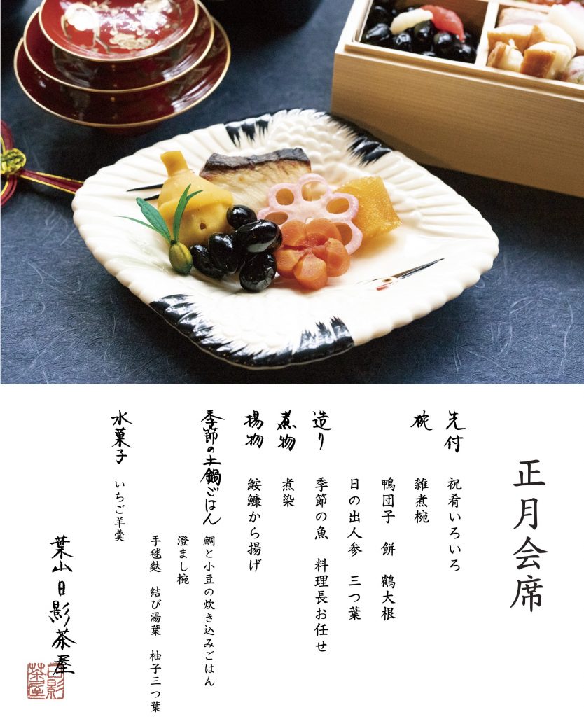 日本料理 日影茶屋では令和8年1月3日(土)~7日(水)の期間、お正月特別会席をご用意いたします。 おせち料理を織り交ぜた会席料理で、新年をお祝いください。